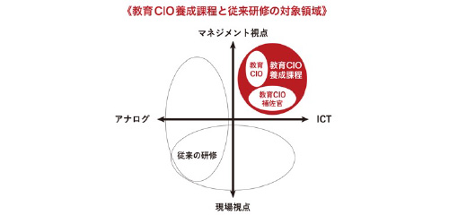 ICTを中心とした教育テックの導入・活用を、社会全体から俯瞰して捉え、経営視点でビジョンを描き、リーダーシップを発揮して推進する責任者である「教育CIO」(Chief Information Officer)を養成。